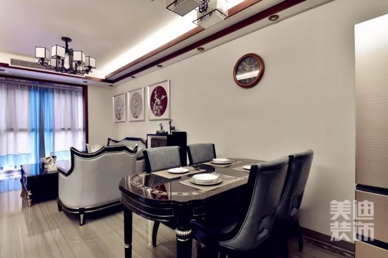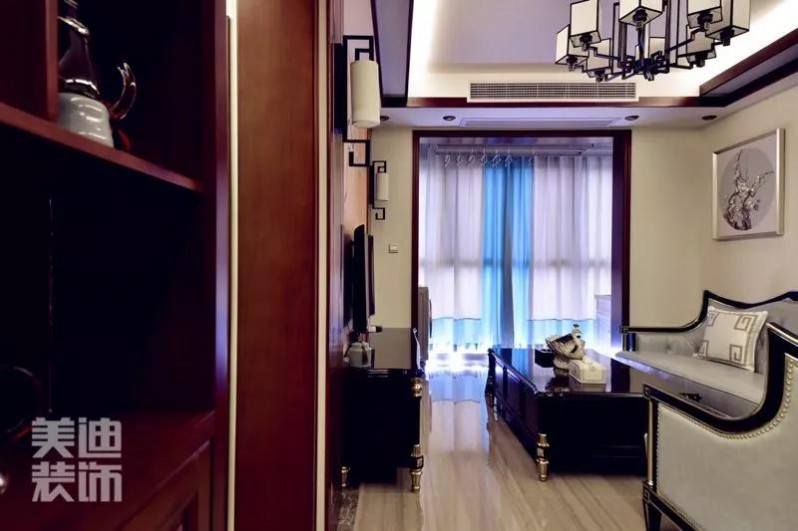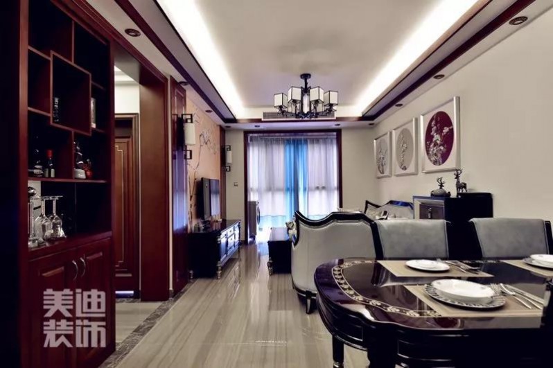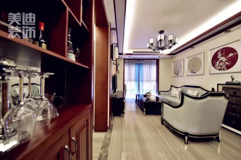這是一張進門照,入戶和酒柜也都是廖女士很滿意的地方,經(jīng)典色系的酒柜與整體的新中式風格映襯得剛剛好。