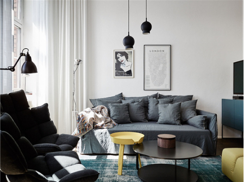 灰色愛上藍色。灰色能夠襯托藍色的明亮,而藍色能突顯灰色的質感,再來一點黃色,點亮整個空間。