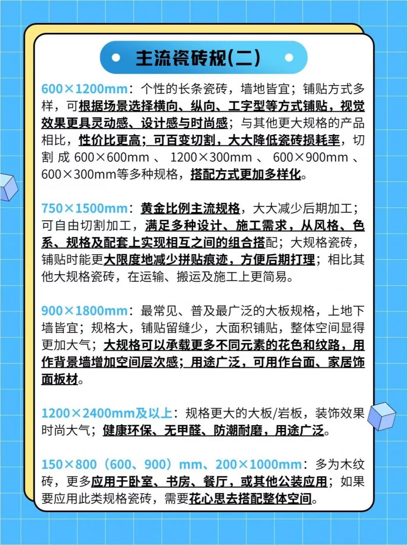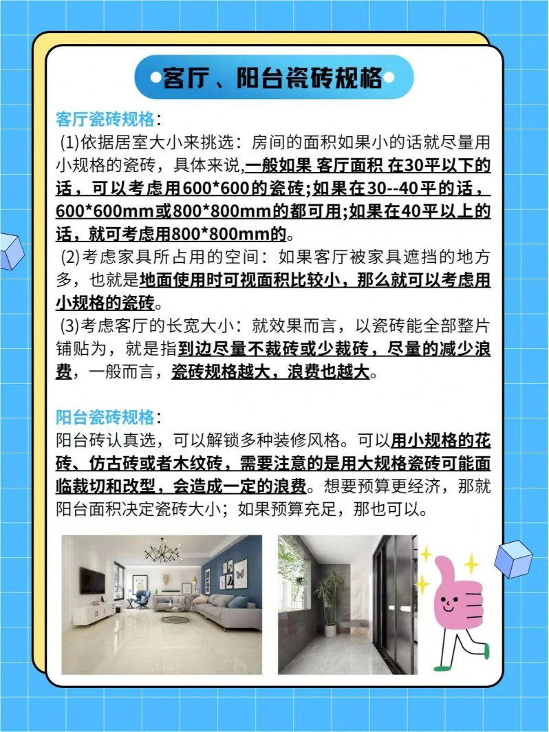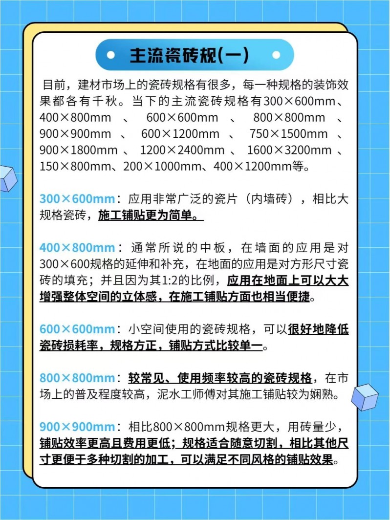 (4)瓷磚規格太大或太小可能會導致鋪貼施工本錢以及運輸搬運本錢增加。