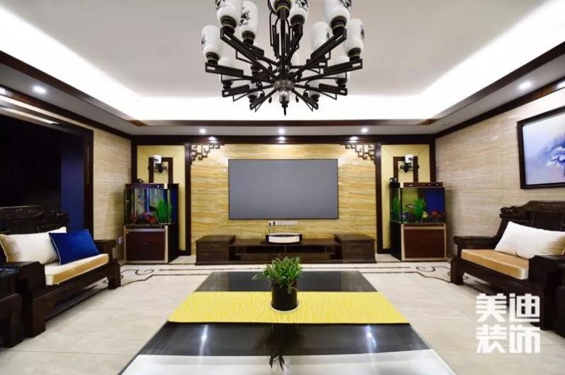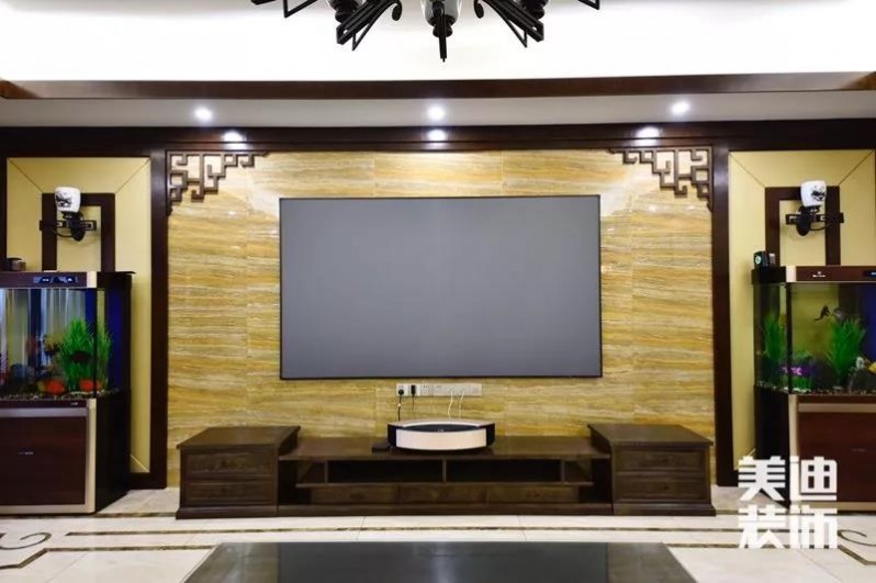 客廳采用大塊面的黑白灰對比,展現簡單的美好。大理石的電視背景墻與兩側的魚缸交相呼應,不多余也不單調。